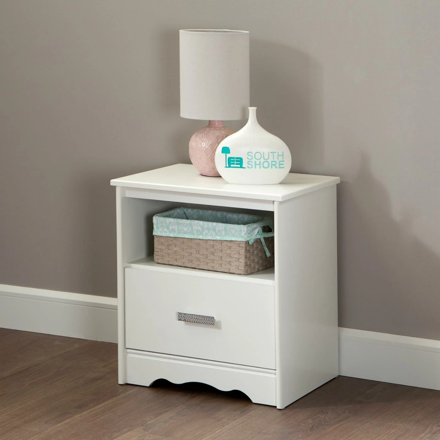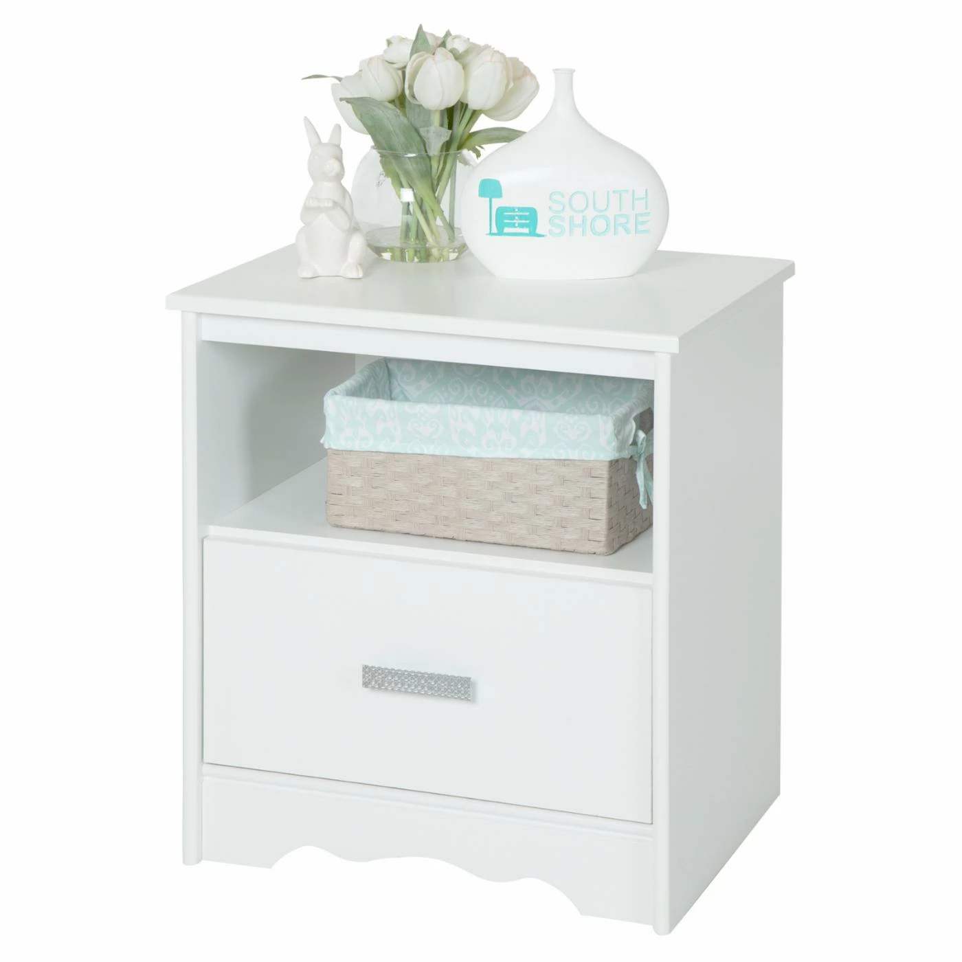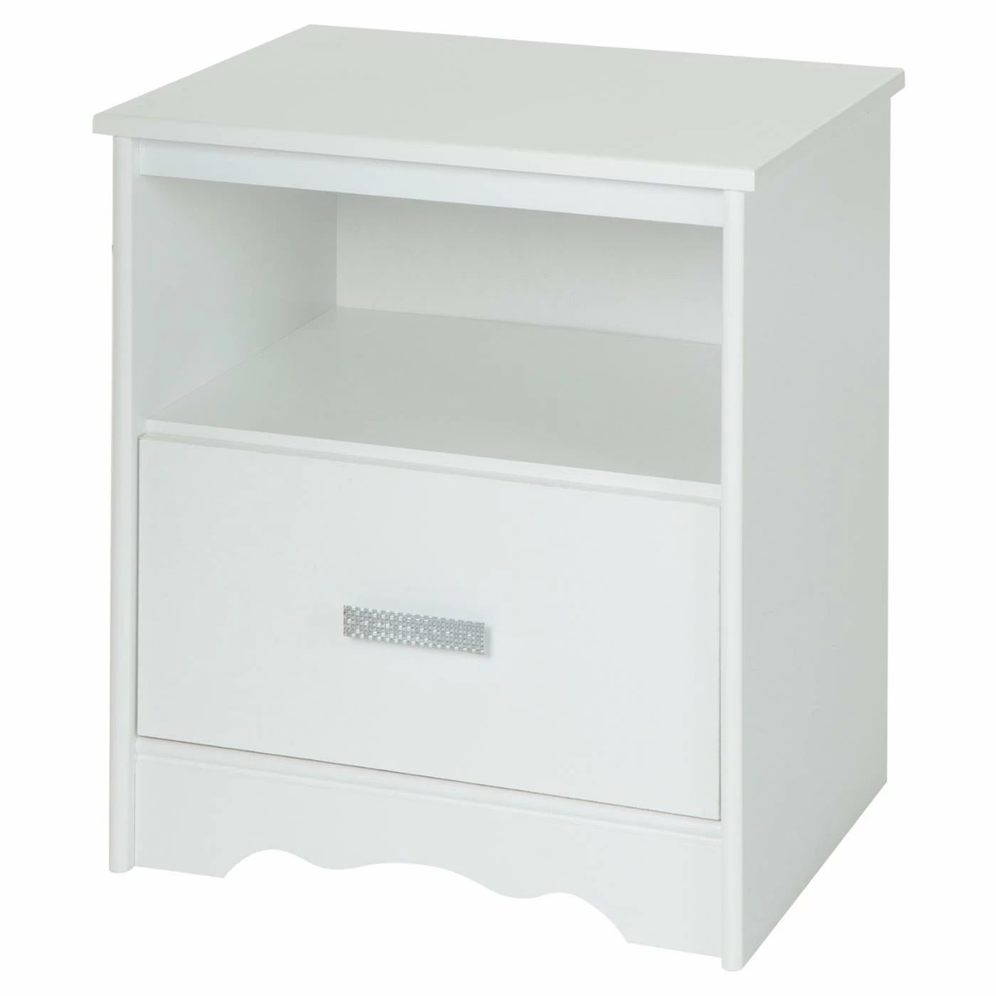 Make sure your little princess can access her royal essentials with ease by placing the South Shore Tiara 1 Drawer Nightstand next to her bed. This pure white nightstand features an open top compartment and smooth-gliding lower drawer on metal slides, giving her plenty of room for stashing small treasures like books, toys, and accessories. A sparkling chrome handle and carved apron bring some elegance to this sweet piece.